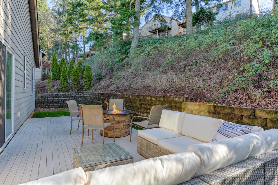 There is an outdoor sectional, table, fire pit, chairs, and cornhole ready for your use in the backyard. Please put the couch cushions back in the closet before you leave. Please also be sure to re-cover the fire pit when not in use (but please make sure to wait at least an hour after fire pit has been turned off to place cover back on to prevent cover from getting melted).